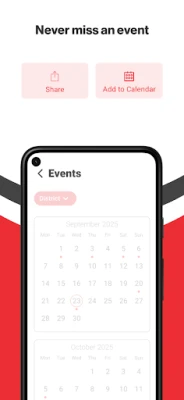 NEVER MISS AN EVENT The event section shows a list of events throughout the district. Users can add an event to their calendar and share the event with friends and family with one tap.