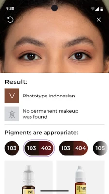 AI-powered pigment color matching: The neural network analyzes the client’s color type and suggests the perfect shade from the NE Pigments palette.