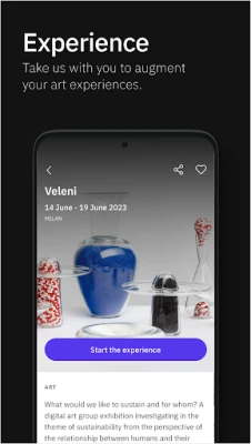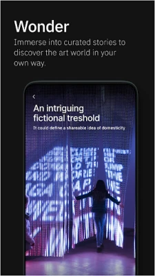 Wander through the Particles: Lose yourself in the never-ending flow of particles: immerse into curated stories to discover the art world at your own pace. Explore events and exhibitions Browse exhibitions from your favorite institutions, galleries and artists or discover unexplored ones, support their activities, and take part in their events. Live an augmented art experience Explore phygital and digital exhibitions with no limits of location and timing. Interact with the artworks around you and dig deeper into the exhibition topic. Share what made you fall in love, and empower the art community