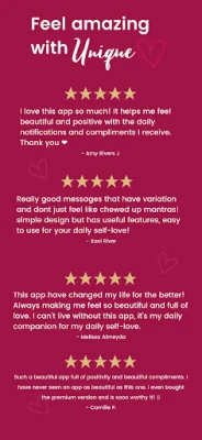 Download Unique today and make self-love a part of your daily life. Start receiving compliments, affirmations, and motivation that truly speak to you. It’s time to celebrate who you are, build lasting confidence, and create a life filled with positivity and purpose—because there’s only one you, and you are truly Unique.